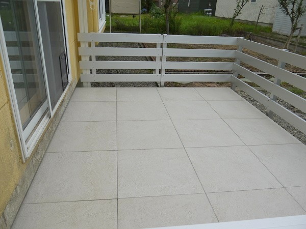 通常のタイルテラスと違うのは、土台の部分です。アルミの基礎ではなく土留め用ブロックを使った方法で地面より30㎝程高くしています。コストを抑えつつ、頑丈で長持ちするテラスです。タイルは60㎝角の大判で上質な磁器質タイルで、色はアイボリー・ブラウン・木目の3色。A様邸はアイボリーです。
