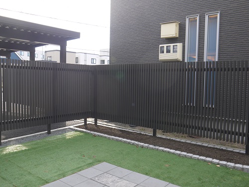 S様邸の前は交通量の多い道路で、特に週末は渋滞し道路側からの視線が気になります。そこで、少し角度が変わると視線が遮断され、プライベートを確保してくれるアルミ製縦格子をお勧めしました。